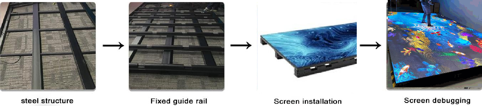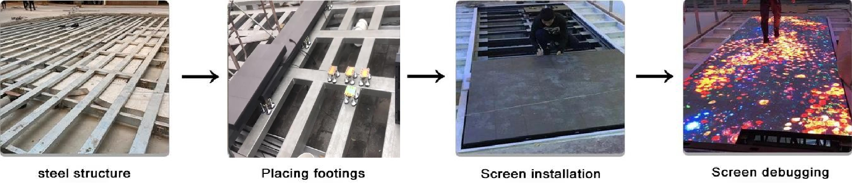 The installation method of LED tile screens can be selected according to the actual on-site environment. They can be directly laid on the ground or welded to steel structures for installation. When laying directly on the ground, the ground must be hardened and soft ground is not feasible.